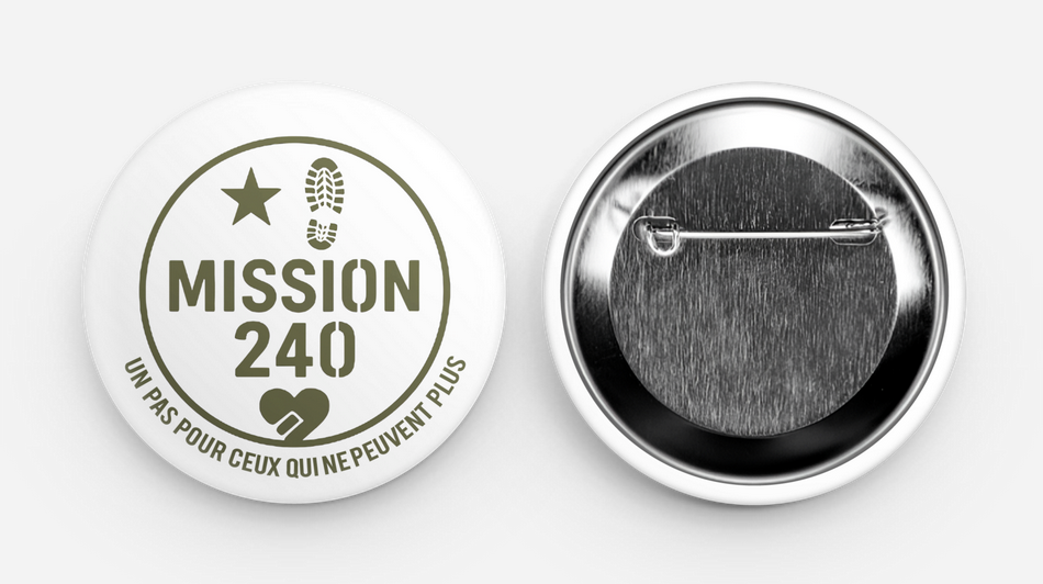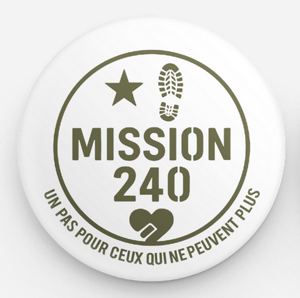 Ce badge officiel Mission 240 (taille 57 mm) a été spécialement conçu pour représenter la devise « Un pas pour ceux qui ne peuvent plus ».