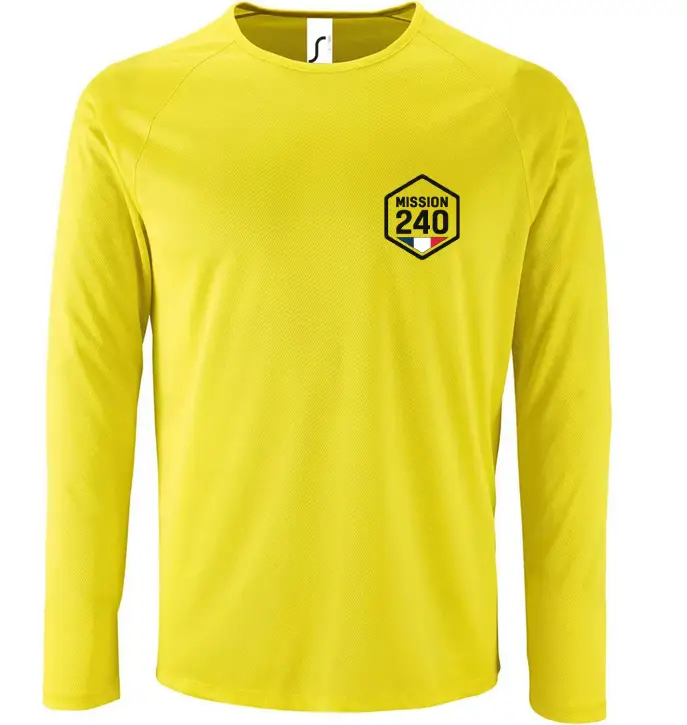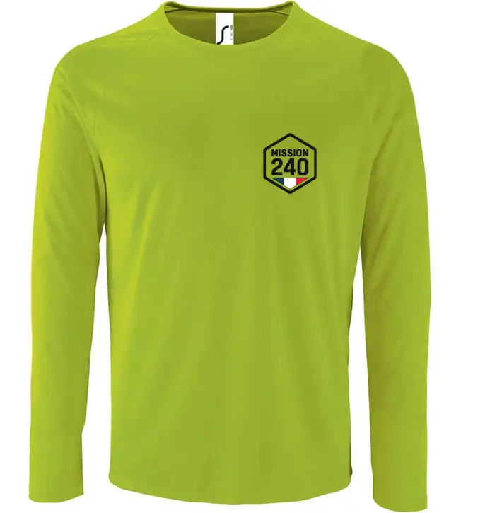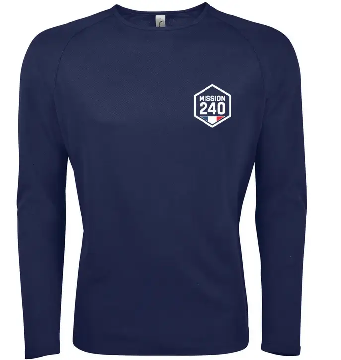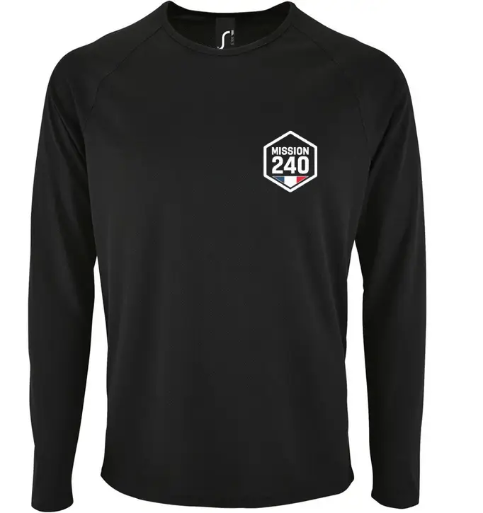 T-shirt de sport manches longues léger et respirant. Logo Mission 240 côté cœur. Idéal pour l’hiver et la mi-saison.