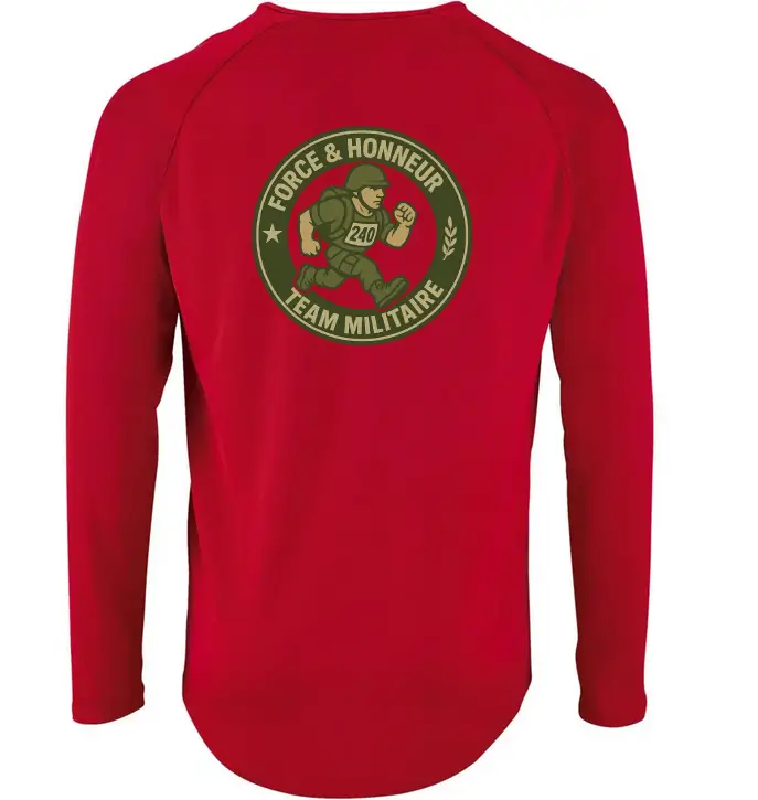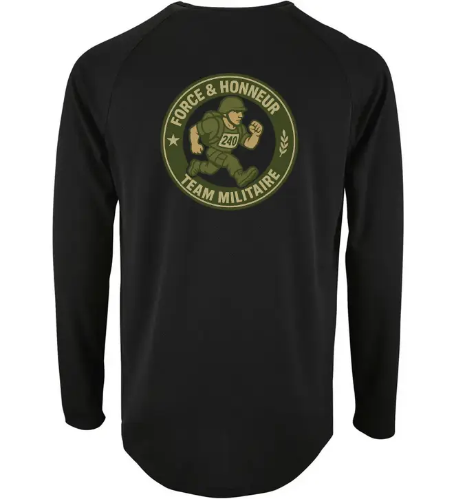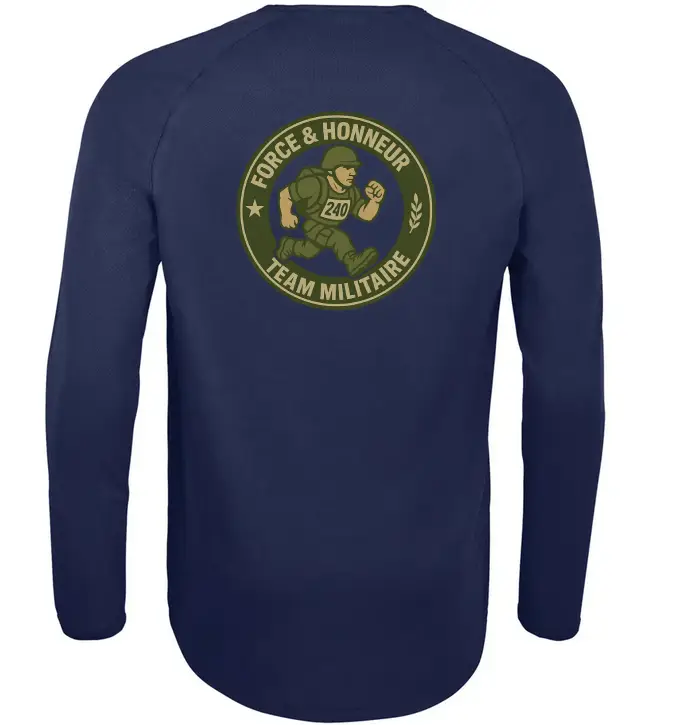 Tee-shirt sport manches longues. Mesh technique 140 g/m², 100 % polyester respirant. Design exclusif Mission 240 « Team Militaire ».