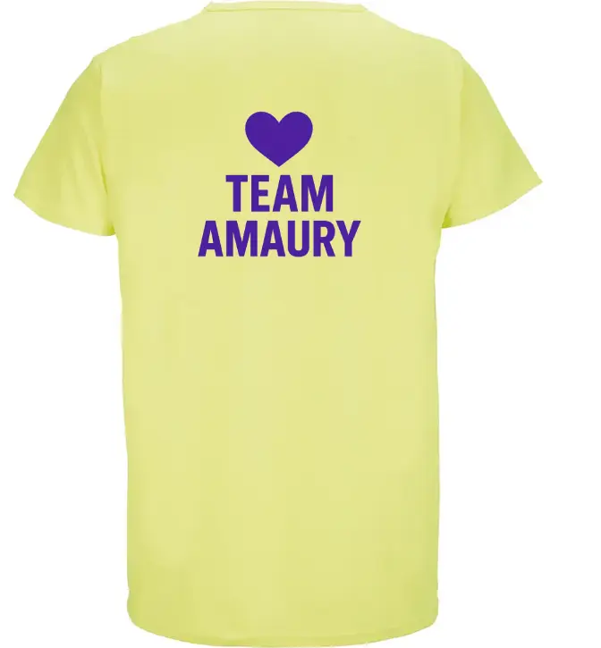 Affichez votre soutien à Amaury avec ce T-shirt de running disponible en jaune fluo et en blanc. Un symbole de solidarité qui allie confort et visibilité.