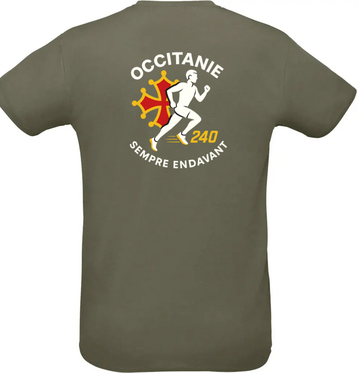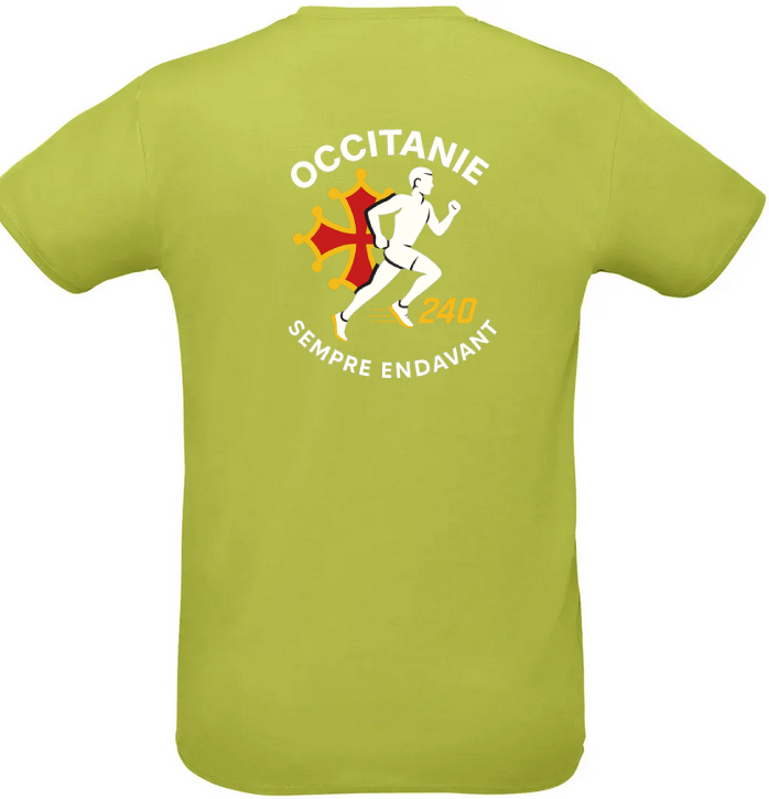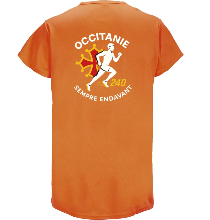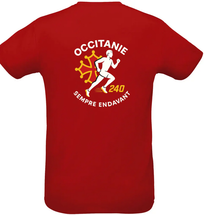 « Sempre endavant » – Toujours en avant.Un T-shirt léger et respirant, aux couleurs de l’Occitanie, pensé pour les coureurs fiers de leur territoire.
