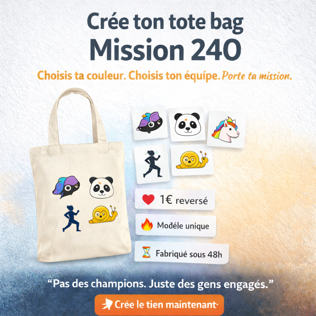 Avec l’Édition Soutien Premium, vous créez un tote bag Mission 240 à votre image.