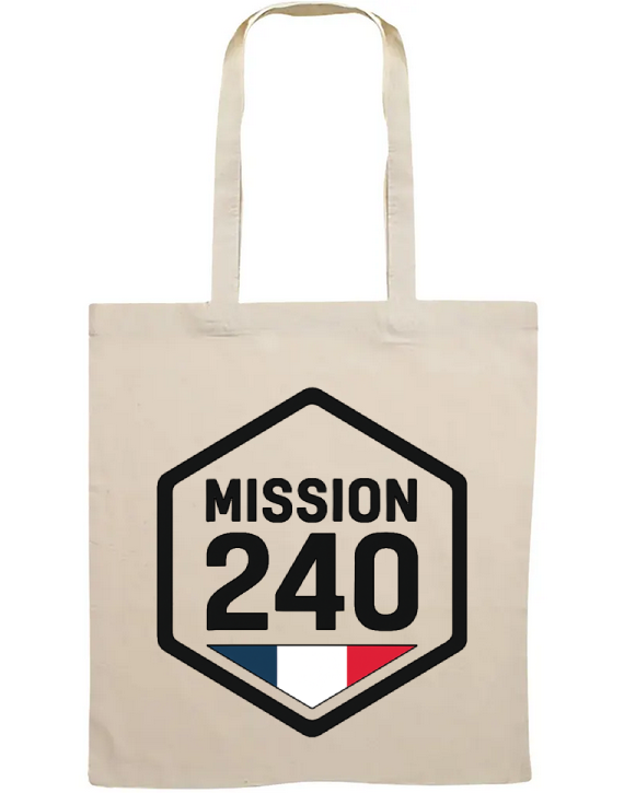 Sac shopping en coton naturel 140 g/m², avec anses longues et coutures renforcées. Pratique, réutilisable et orné du logo officiel Mission 240.